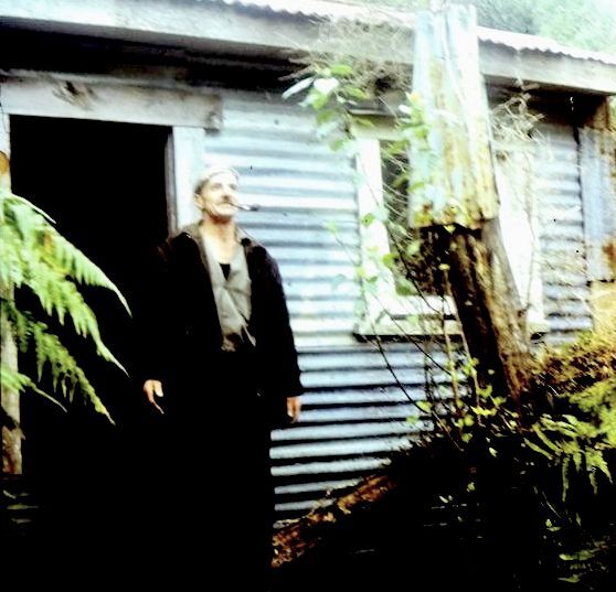 George Wallace outside his hut near the old Whataroa bridge.1974.
