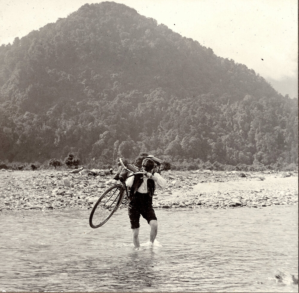 Crossing Waitangi River,near Whataroa, South Westland.ca .1906.