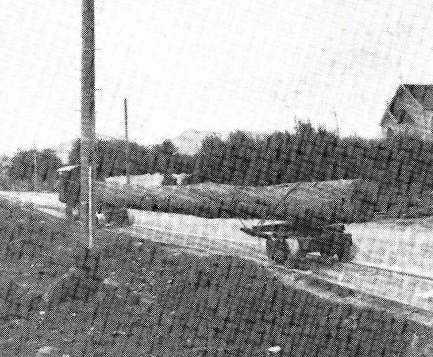Lokey lugging another massive log along Bottom Road to the mine sawmill. Waiuta.ca.1932.
