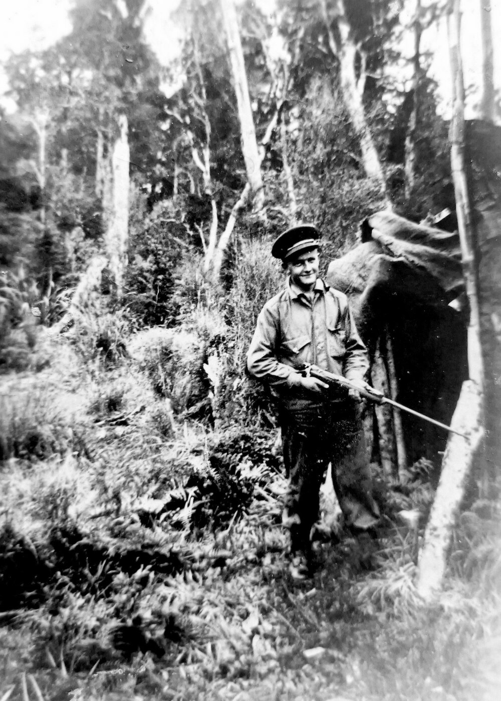 West Coast New Zealand History (28th Feb 2026). James (Jim) Crowe outside a bush hut at Mt. Glasgow, near Seddonville, Northern Buller .mid 1940`s.. In Website West Coast New Zealand History. Retrieved 29th Mar 2026 16:09, from https://westcoast.recollect.co.nz/nodes/view/33085