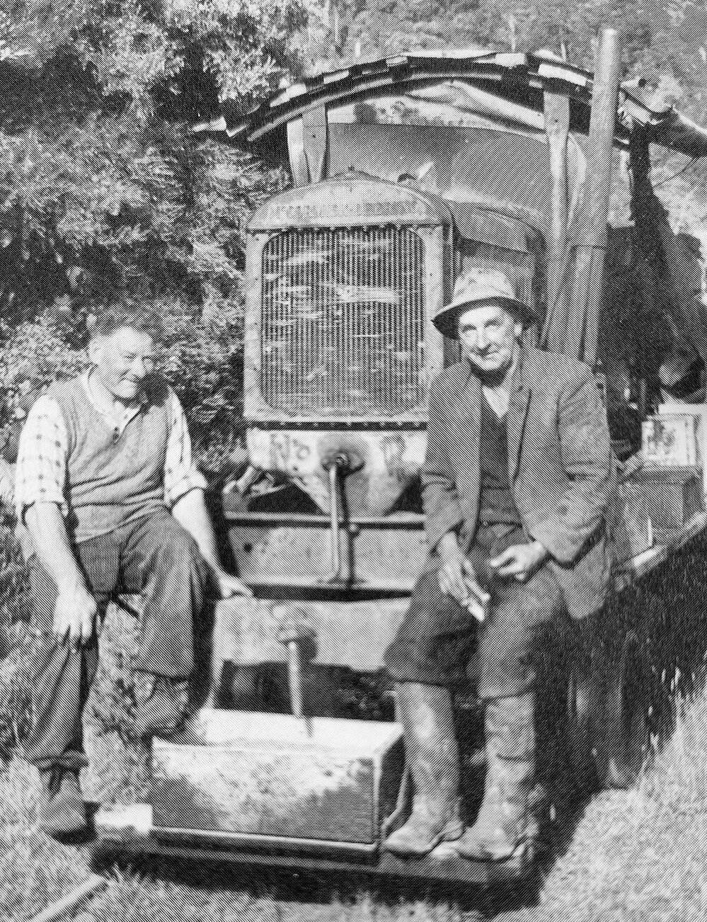 Ivan Randall and Bill Muir on a locomotive used by Kaniere Sawmilling Company in the 1950`s.