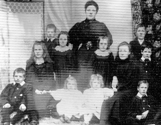 As far as identifying the members is concerned, there is always an element of doubt, but the following are pretty clear: the tall woman in the back row is not Allison, the mother, but Susanna, the eldest daughter; she and the other two girls born in Scotland (Jane and Elizabeth), are easy to spot. The twins (one of which would be our grandmother, Mary) would be the two girls in identical dark-coloured dresses standing in front of Susanna, and the two little ones in white would be Margaret and Charlotte (the youngest, our great-aunt "Lottie"). The boy in the back row next to Susanna would be William John, but the other four are anyone's guess.