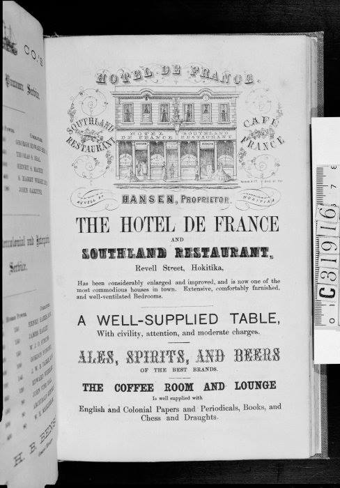 West Coast New Zealand History (22nd Nov 2015). Hotel de France, Hokitika advertisement, 1866.. In Website West Coast New Zealand History. Retrieved 25th Apr 2026 00:51, from https://westcoast.recollect.co.nz/nodes/view/3324