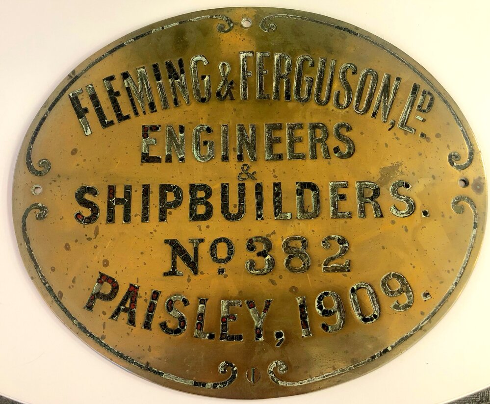 The original 1909 Fleming & Ferguson Shipbuilders Brass ID Plate showing their Yard Number 382