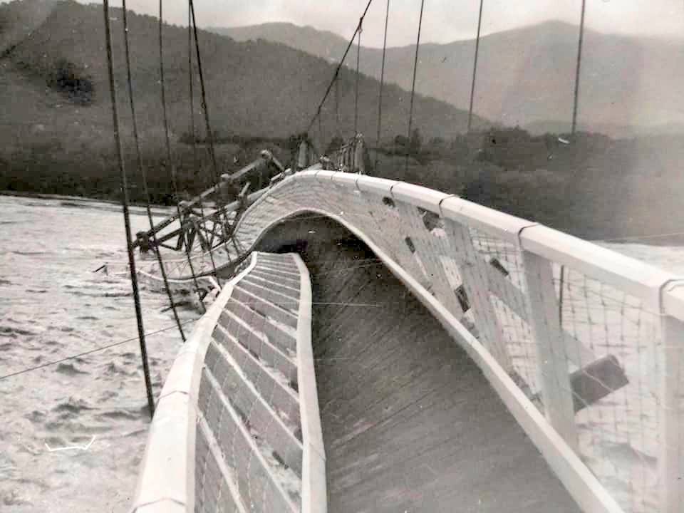 Damaged pedestrian bridge across Grey river near Blackball,1973.