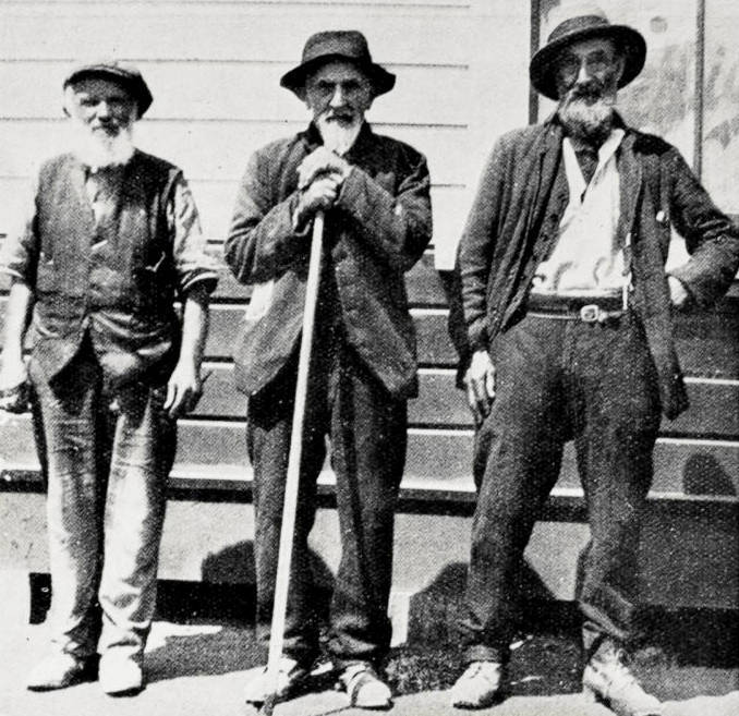 Goldminers J. Scholefield, 75, A. Dellow, 80, and T. Dellow, 70 - Paenga,Murchison District.19 Mar,1930.