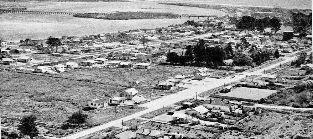 The town of Hokitika with Hokitika River and bar in the background.1939.