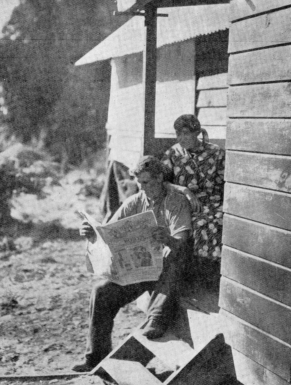 Reading a copy of the Weekly News at a Roadman's home on the Fox Glacier road near Weheka,1937.