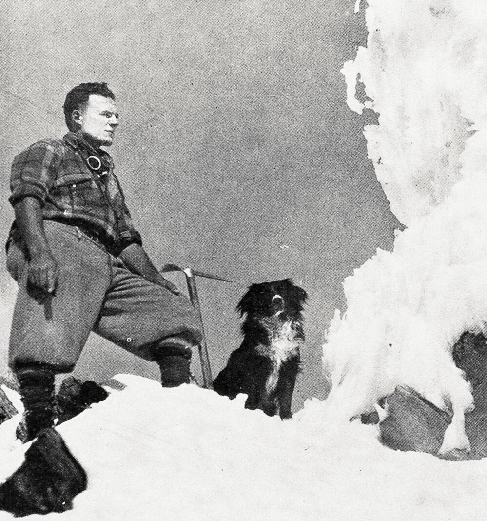 Alpine guide, Frank Alack, with his dog,crossing the Southern Alps from Westland to the Hermitage, Mount Cook.1932.