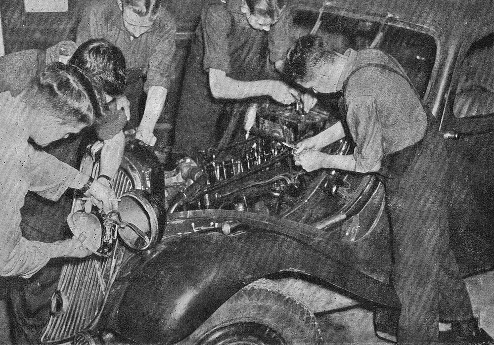 Motor-car engine provides practical work for young mechanics at Westport District High School,1939.