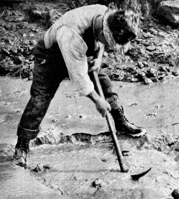 Clearing a snag at the entrance to a pipe on a West Coast claim at Addison's Flat, near Westport .1940.