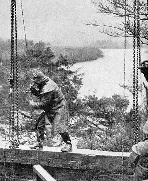 Working on an overhead cable transporting material across the Buller Gorge.1939.