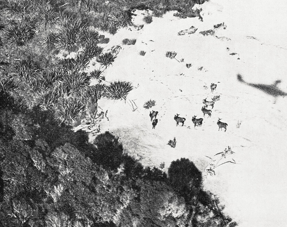 Aerial photo of a small herd of deer seen from the mail plane on the Hokitika/Haast/Okuru airmail route.1935.