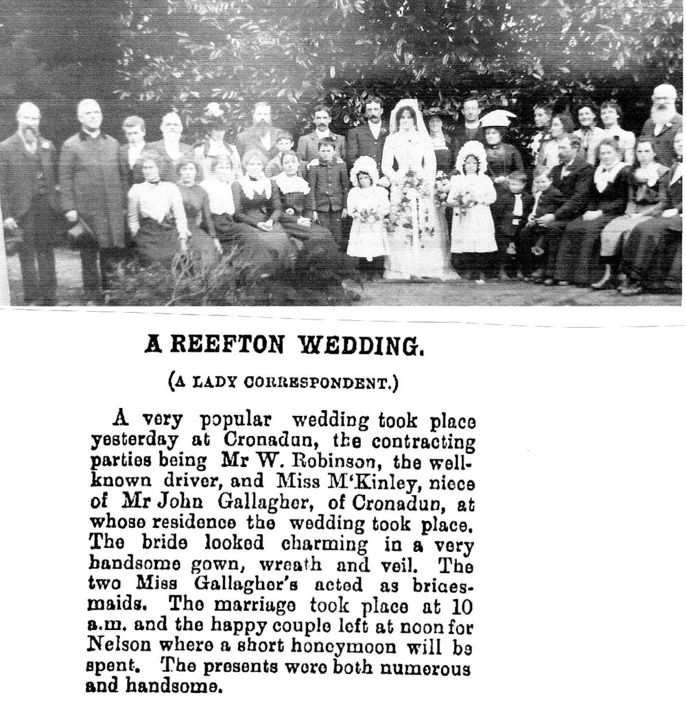 West Coast New Zealand History (31st Dec 2024). Wedding beween W Robinson and Miss McKinley,niece of Mr John Gallagher of Cronadun.. In Website West Coast New Zealand History. Retrieved 23rd Mar 2026 14:25, from https://westcoast.recollect.co.nz/nodes/view/34275