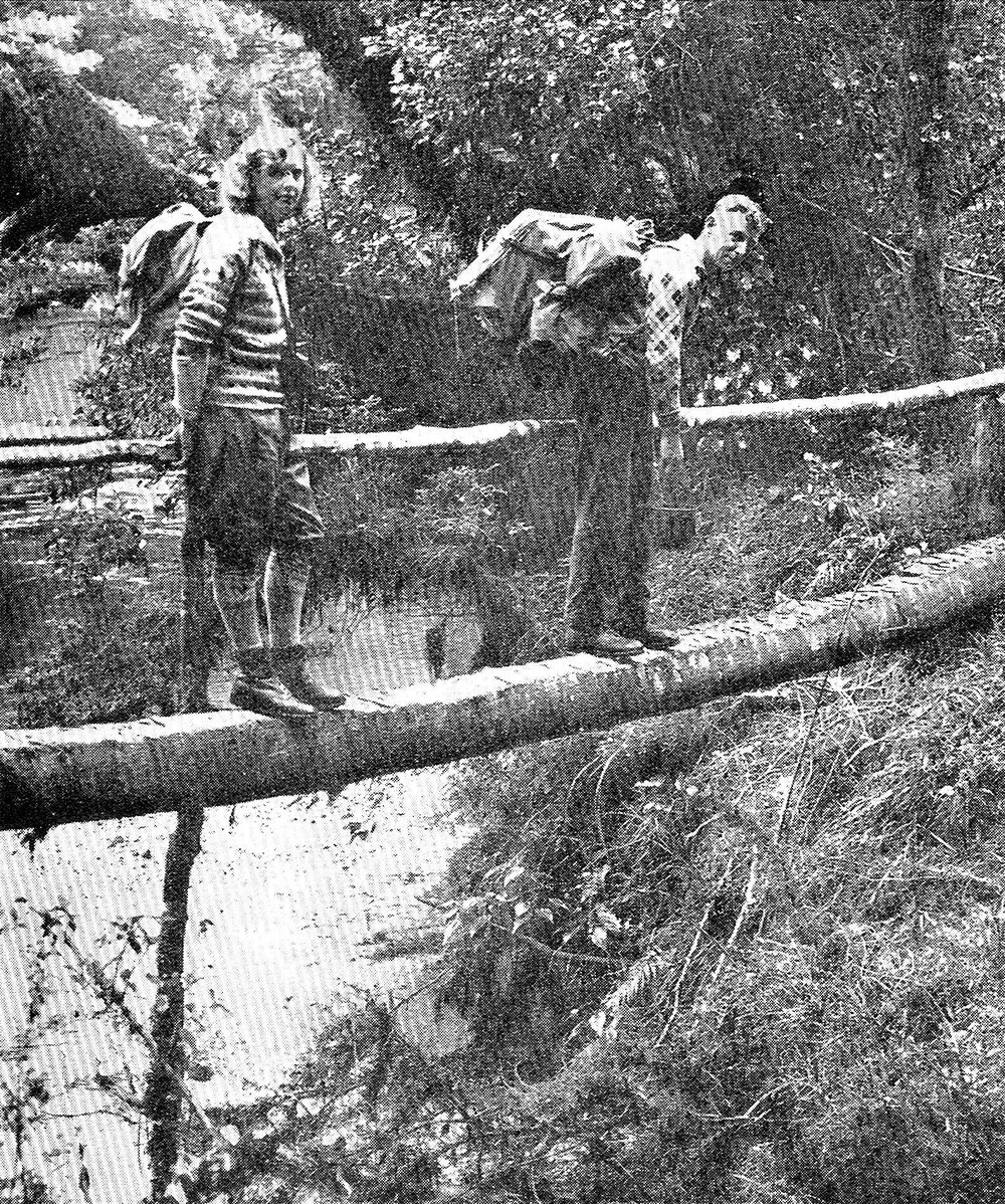 Trampers on bush bridge, Freeman River, South Westland.1939.