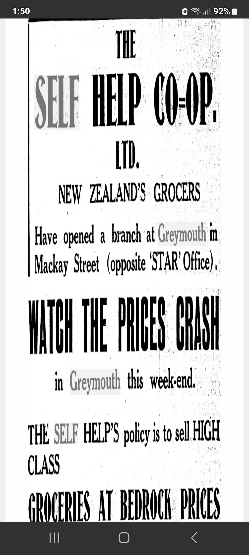 West Coast New Zealand History (20th Feb 2025). In 1937 the first Self Help grocery store opened in Greymouth.. In Website West Coast New Zealand History. Retrieved 22nd Mar 2026 19:25, from https://westcoast.recollect.co.nz/nodes/view/34524