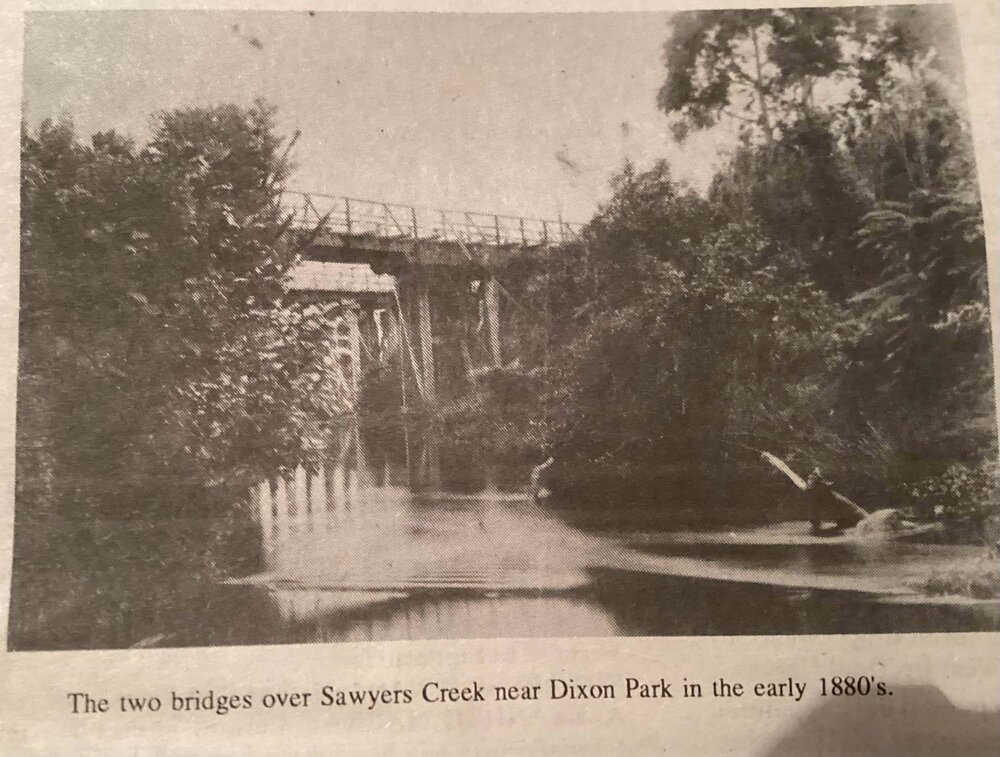 Two bridges over Sawyers Creek near Dixon Park, early 1880s