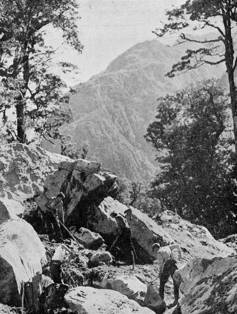 Clearing a rough section of the route before blasting away huge boulders- on the new Hollyford - Okuru Road.1938.