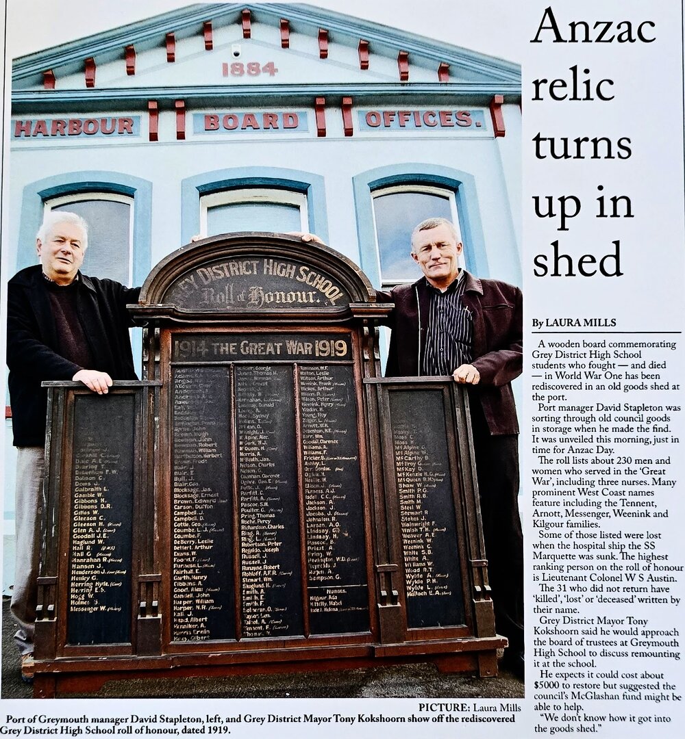West Coast New Zealand History (22nd Jul 2025). Greymouth High School World War I roll of honour board/plaque *PHOTO ALBUM*. In Website West Coast New Zealand History. Retrieved 21st Mar 2026 12:56, from https://westcoast.recollect.co.nz/nodes/view/34992
