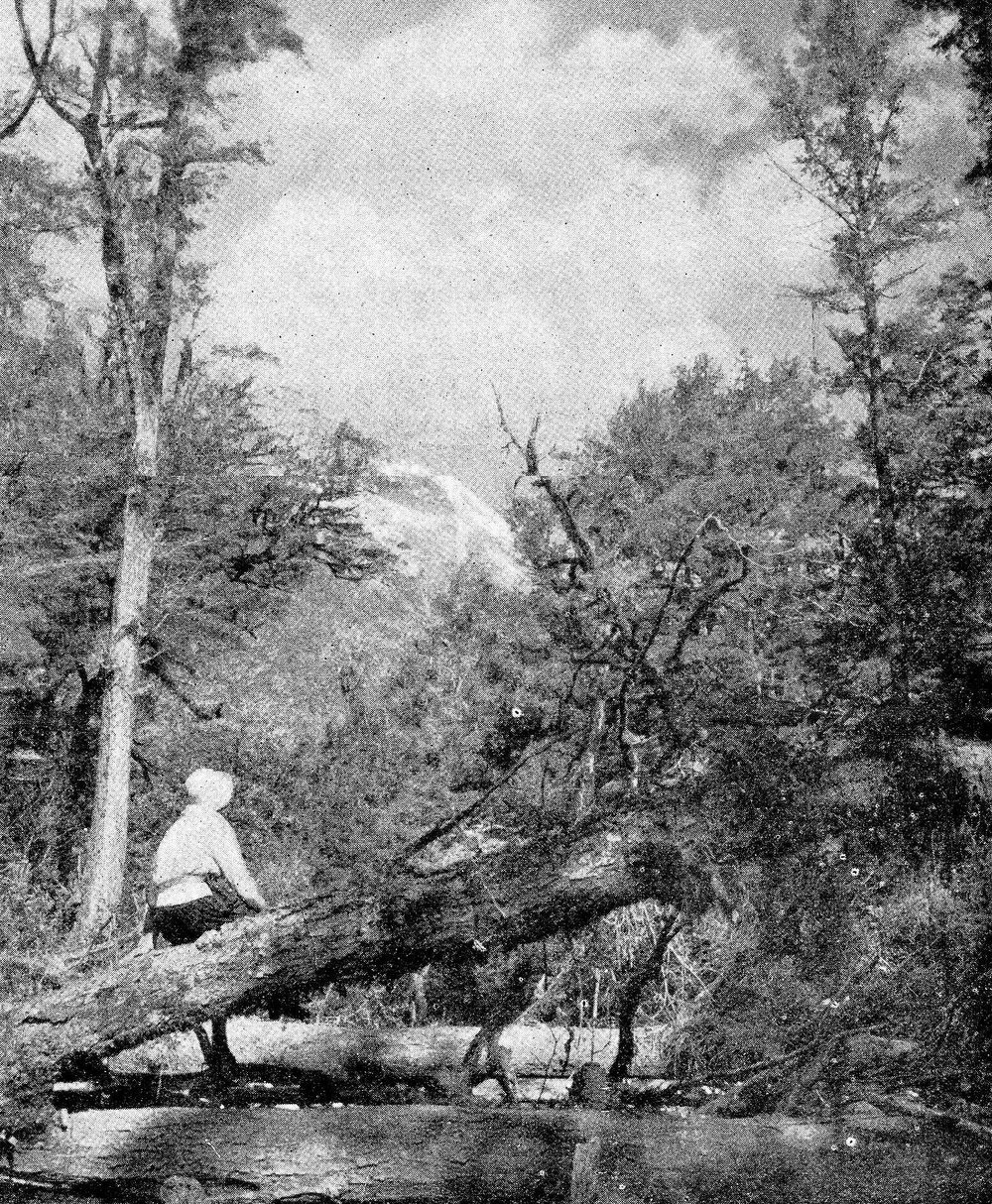 A woman sitting on a fallen tree trunk straddling Eros Creek, looking up towards a snow-covered Mount Eros, Arawhata Valley, Westland,1938.