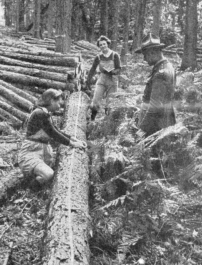Land Girls measuring logs under direction of Captain J.O. Gough.1941.