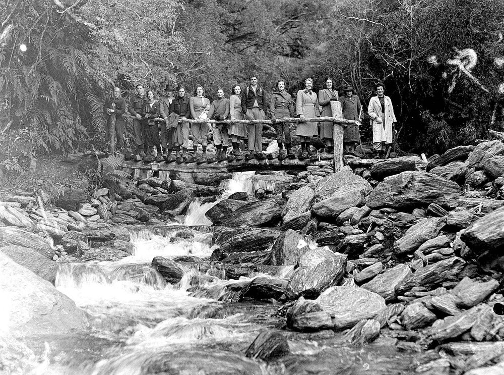 West Coast New Zealand History (15th Sep 2025). Trampers standing on a wooden footbridge over a mountain stream in South Westland, exact location unknown.1947.. In Website West Coast New Zealand History. Retrieved 20th Mar 2026 15:02, from https://westcoast.recollect.co.nz/nodes/view/35253
