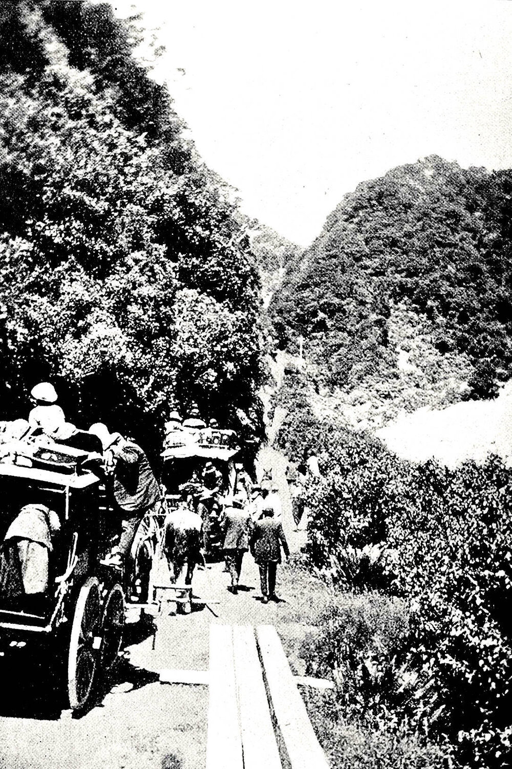 Passengers walking up a steep part of the Otira Gorge.1922.