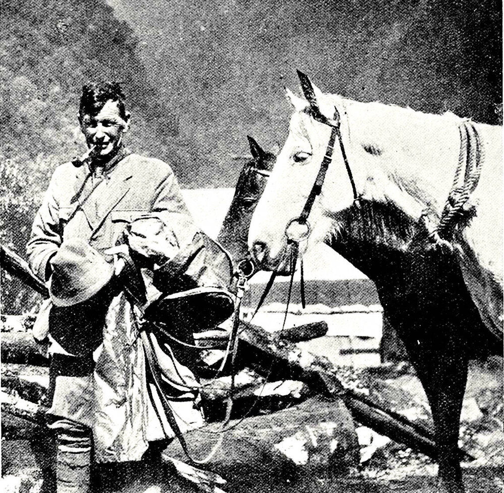 West Coast guide, Mr A. Graham, with his horses on the Waiho-Weheka forest route in Westland.1929.