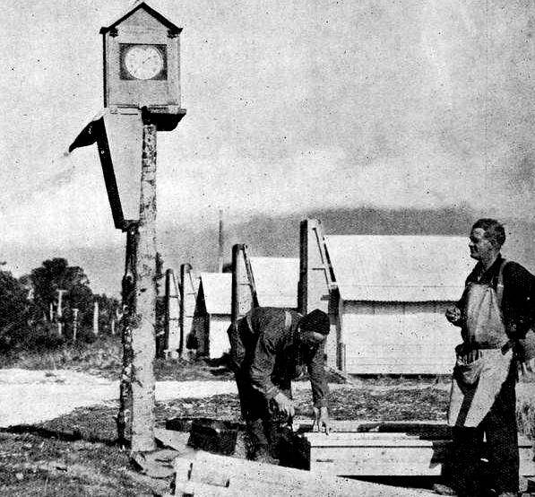 The camp clock at the main construction camp beside the Mahitahi River, Bruce Bay.1937.