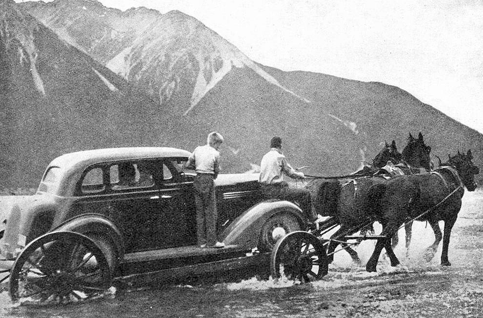 West Coast New Zealand History (9th Oct 2025). A car being hauled across the river on a dray, before the Waimakariri bridge opening.1936.. In Website West Coast New Zealand History. Retrieved 20th Mar 2026 01:25, from https://westcoast.recollect.co.nz/nodes/view/35440