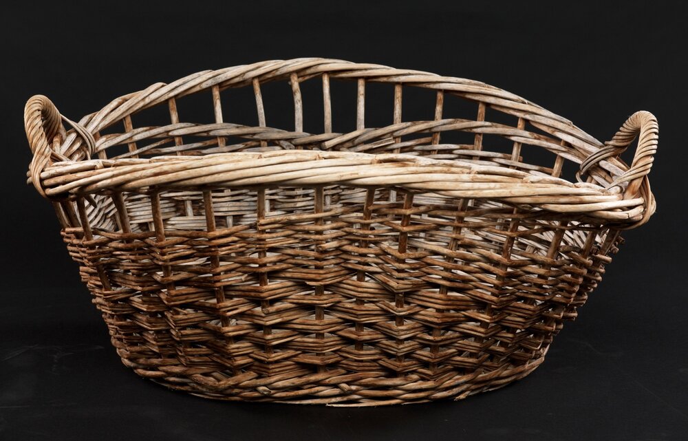 Made of willow. When I was young ? in the 60s there was a family cutting and processing willow for baskets. This was on a tributary of the Waimakariri river by Johns Road, Harewood, Christchurch. There are still some farms about. ?