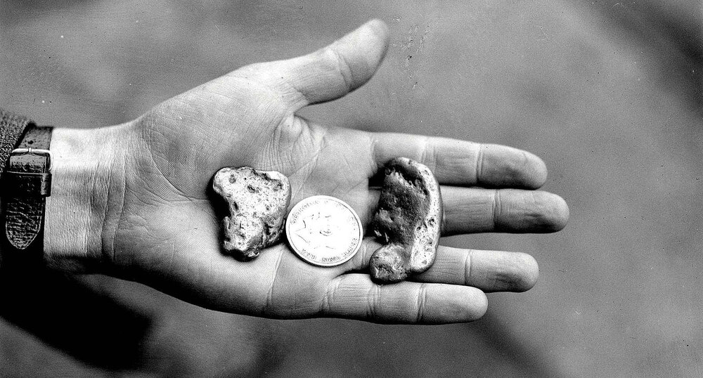 Two nuggets of gold and a George V half-crown displayed on the open palm of a gold miner at Murchison.1932.
