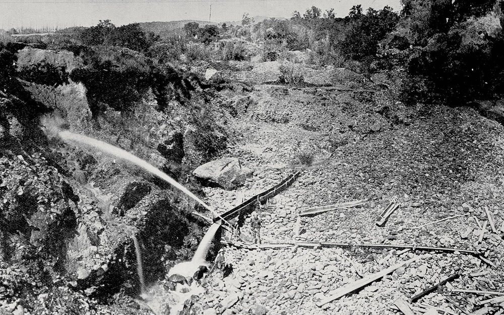 Mr J P Muir's alluvial gold mining claim, Shellback Gully, Ross.1902.