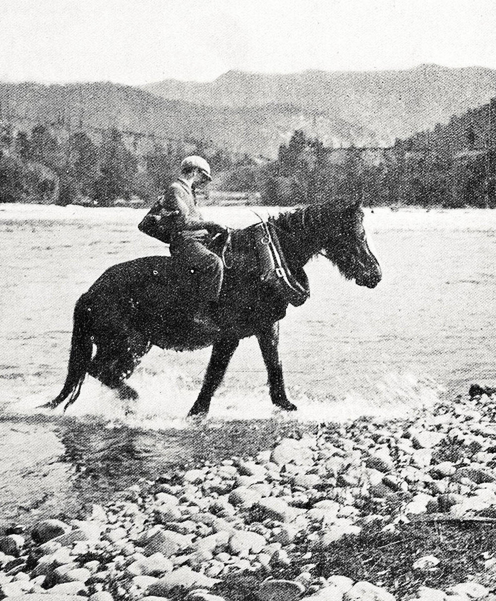 A timber worker on horseback returning home from a days work at the mill.Buller District.1931.