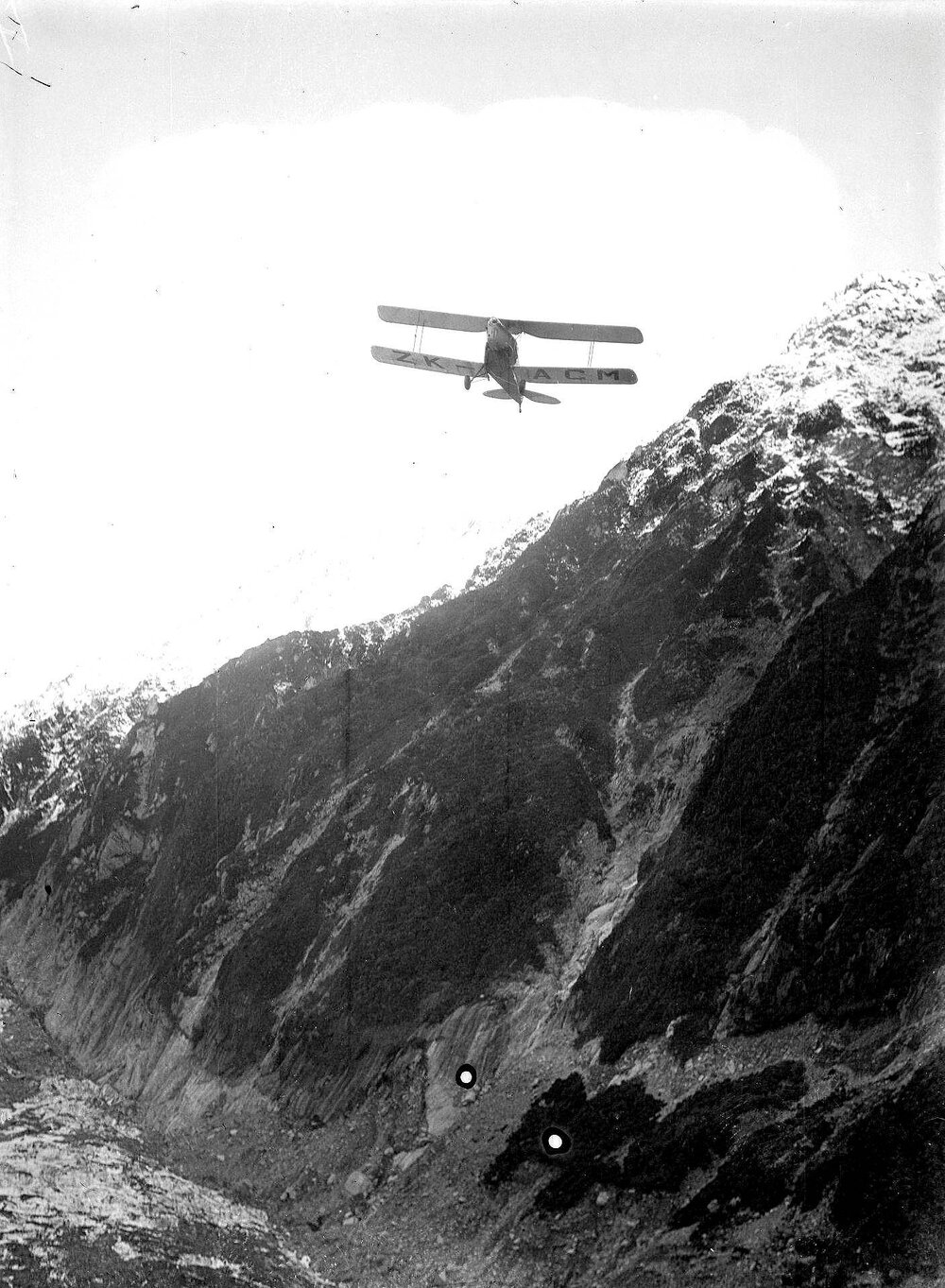 An Avro 594/616 Avian (ZK-ACM) flying over the Franz Josef Glacier in the Westland Tai Poutini National Park.ca.1930`s.