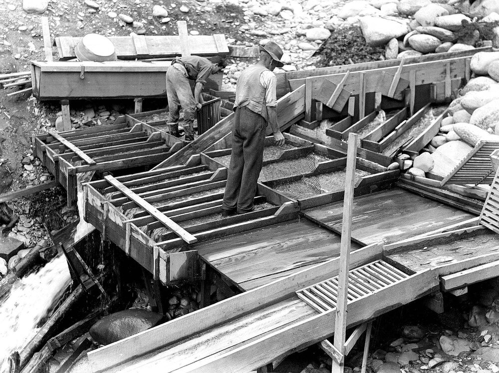 West Coast New Zealand History (6th Apr 2026). Two men inspecting a bank of sluice boxes during gold mining operations in Westland. Exact location unknown.1935.. In Website West Coast New Zealand History. Retrieved 7th Apr 2026 23:19, from https://westcoast.recollect.co.nz/nodes/view/35963