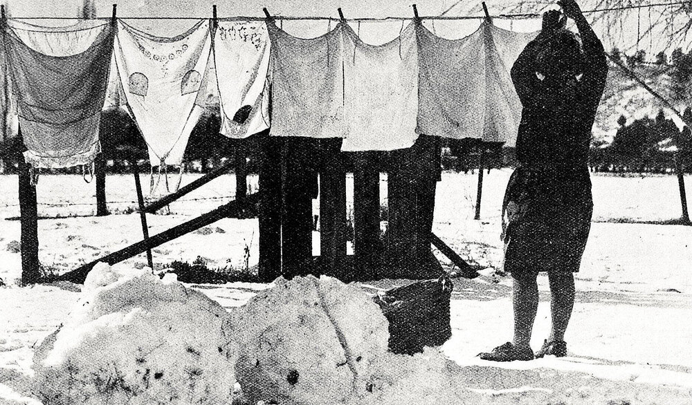 A woman hangs out washing even though the ground was covered in snow.1931.
