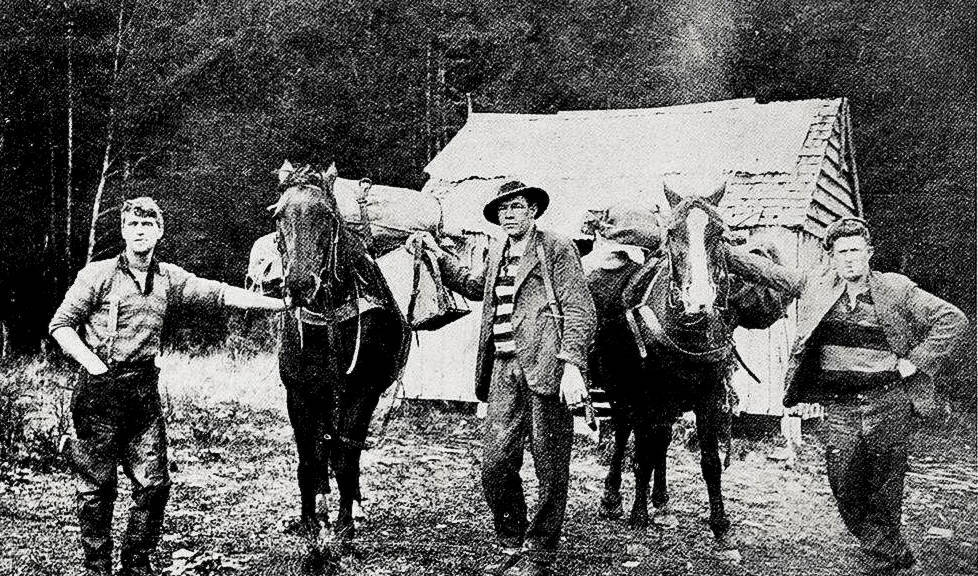 Prospectors from the upper Matakitaki River district can be seen packing stores into their camp at Burn Creek.1933.