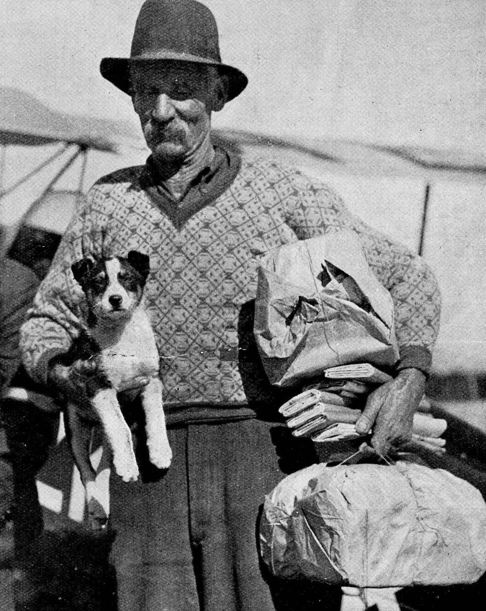 A man holding a puppy in one hand and airmail in the other - Arrivals at Haast on a South Westland Air Service airplane.1936.