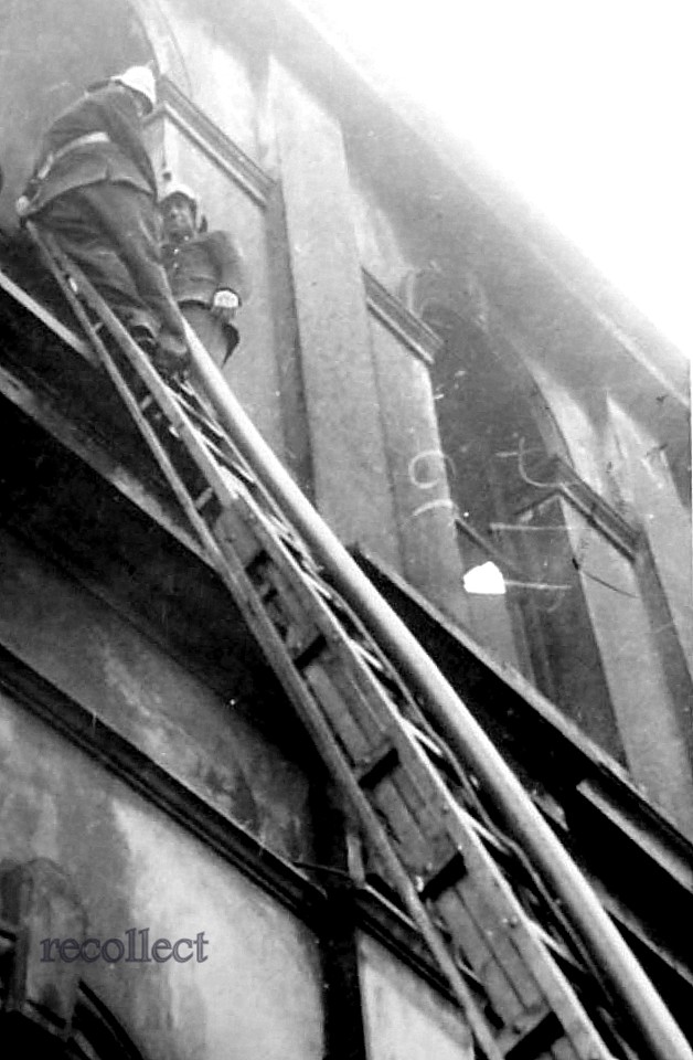 George Williams of Cobden, up the ladder fighting the Greymouth Town Hall fire in 1947.